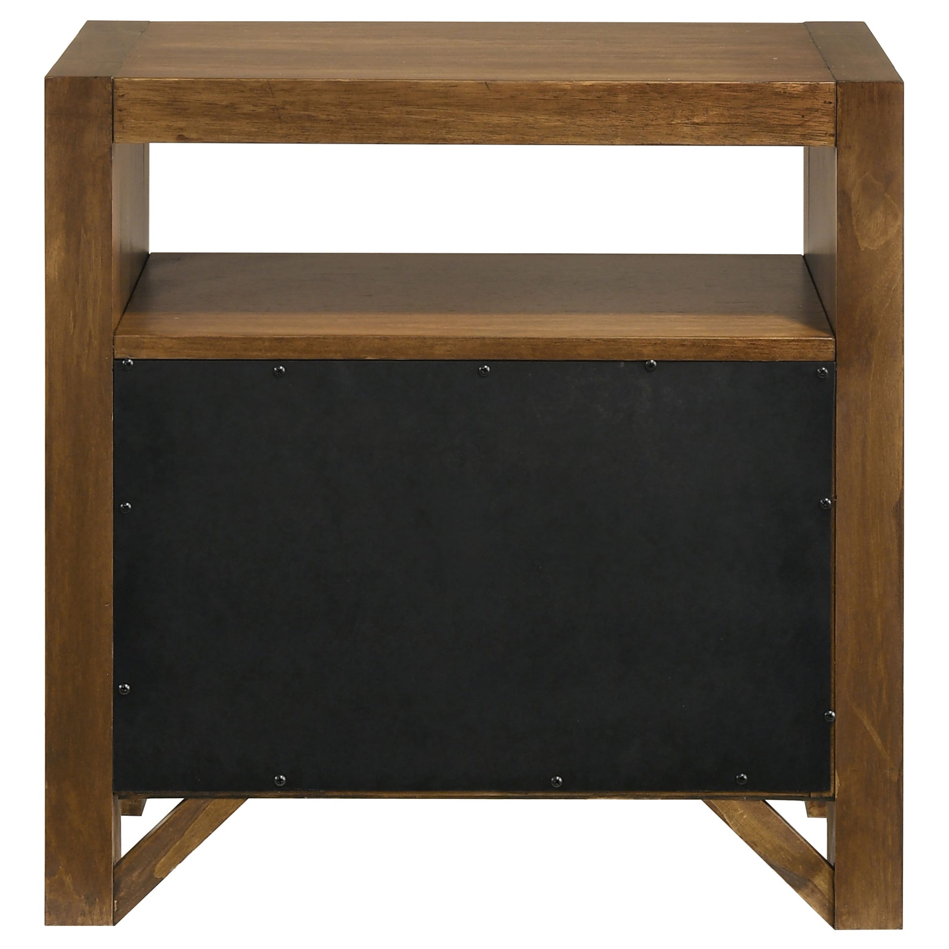 • Warm brown nightstand with open shelf and two drawers has stout posts and brass pulls