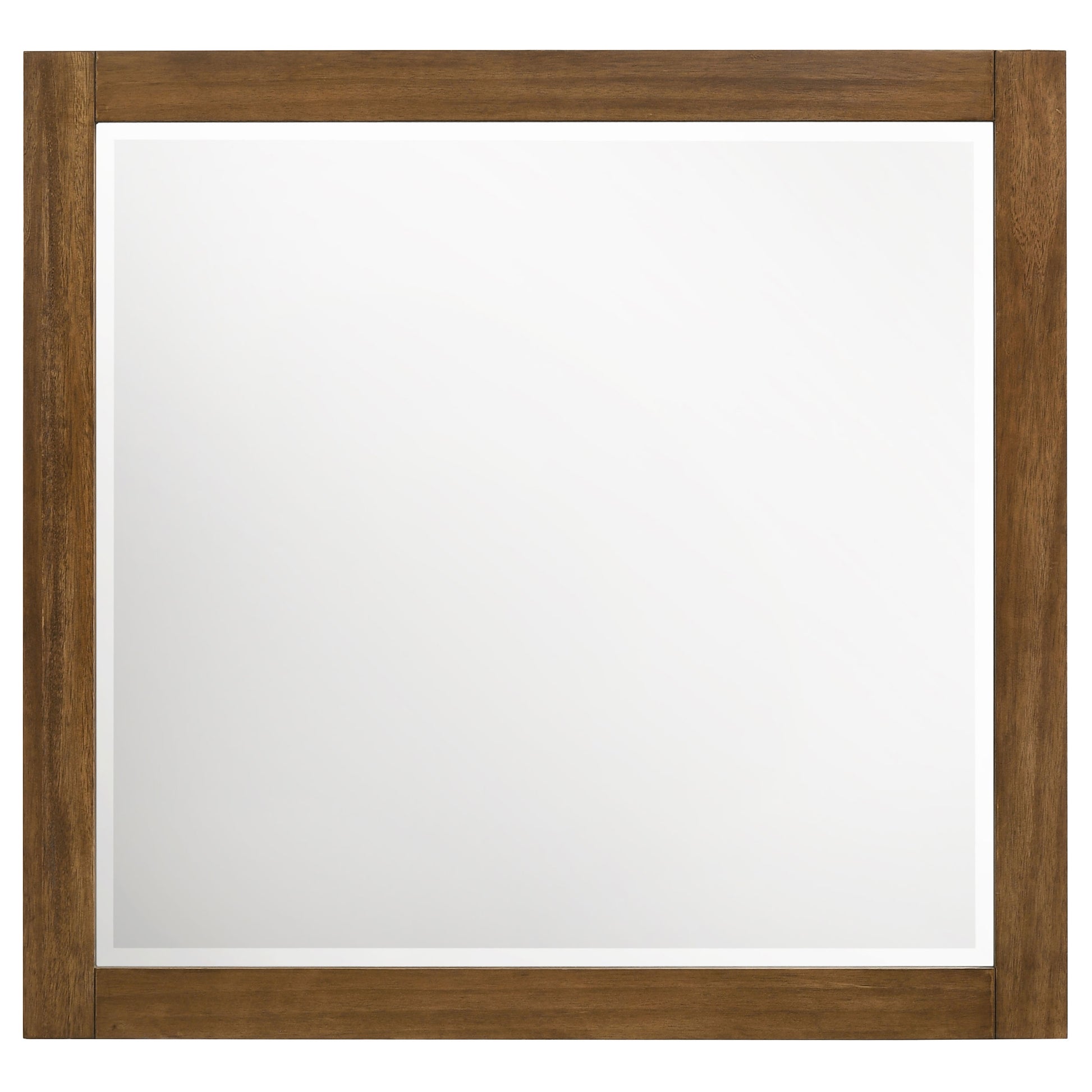• Warm brown dresser mirror features a one-inch beveled edge and stout frame profile