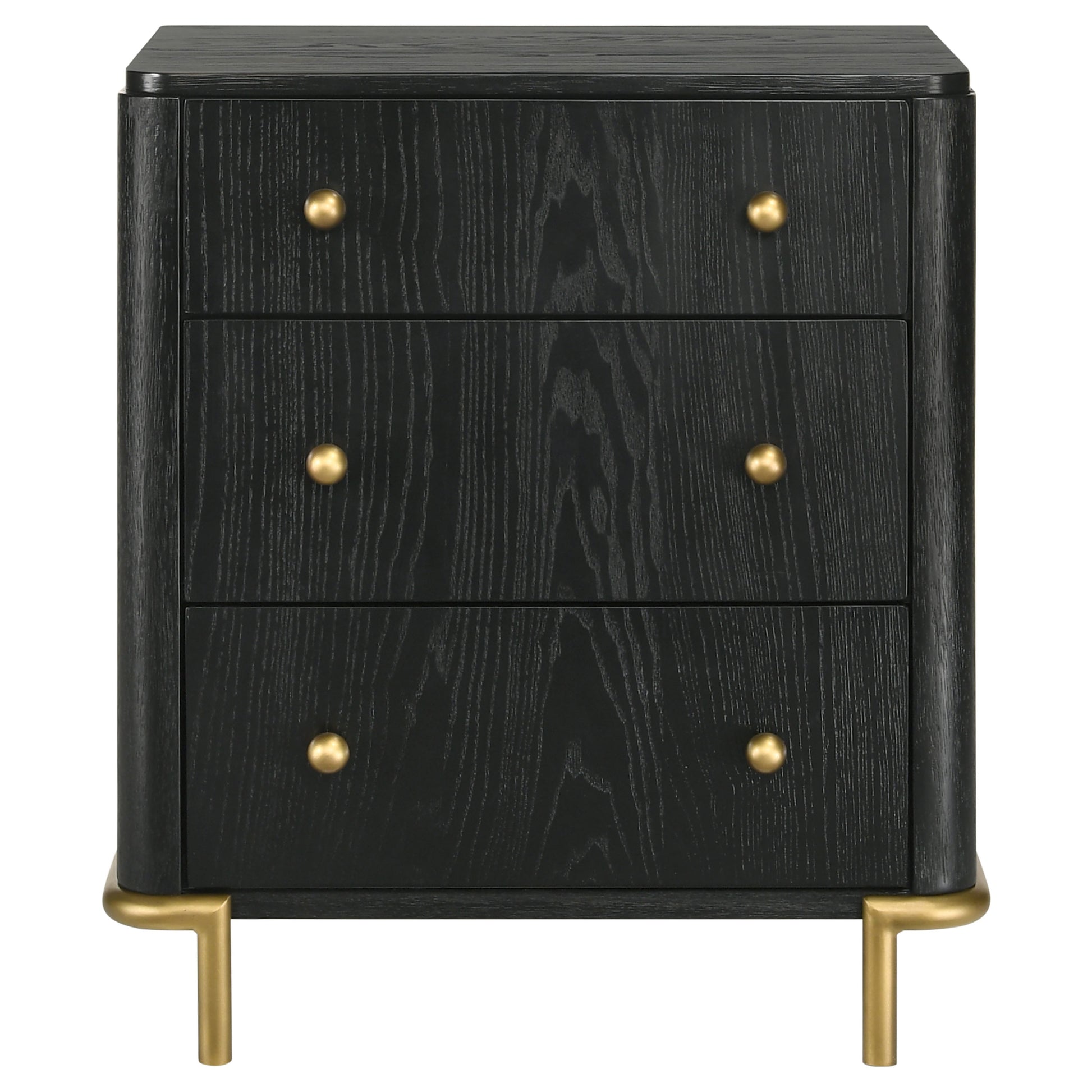 Nightstand brings bedside storage into a more tailored expression with three drawers, rounded edges, and slim metal legs that lighten the profile. Ash veneer over durable wood construction adds subtle grain character and warmth, while aged brass hardware sharpens the silhouette with quiet contrast. A built-in USB-A and USB-C outlet keeps daily charging close at hand without adding clutter to the top. It supports an organized bedside routine with polish, texture, and everyday ease.