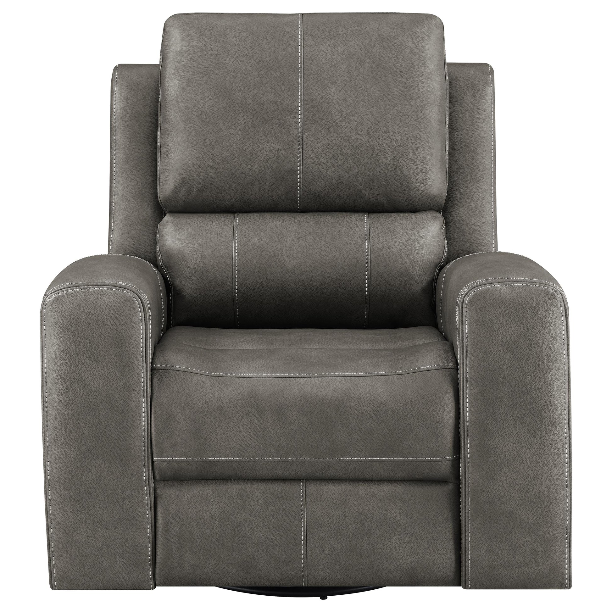 This triple power recliner chair invites you to unwind with motion, support, and quiet luxury. Wrapped in soft leatherette upholstery, it offers a supple touch that enhances every moment of rest. A gliding and swivel base flows effortlessly while plush cushions and contouring lumbar support cradle the body. Power headrest, lumbar, and recline functions adjust at your command. Hidden cup holders and built-in USB A and USB C ports add thoughtful convenience, while an emergency power-down port offers peace of mind.
