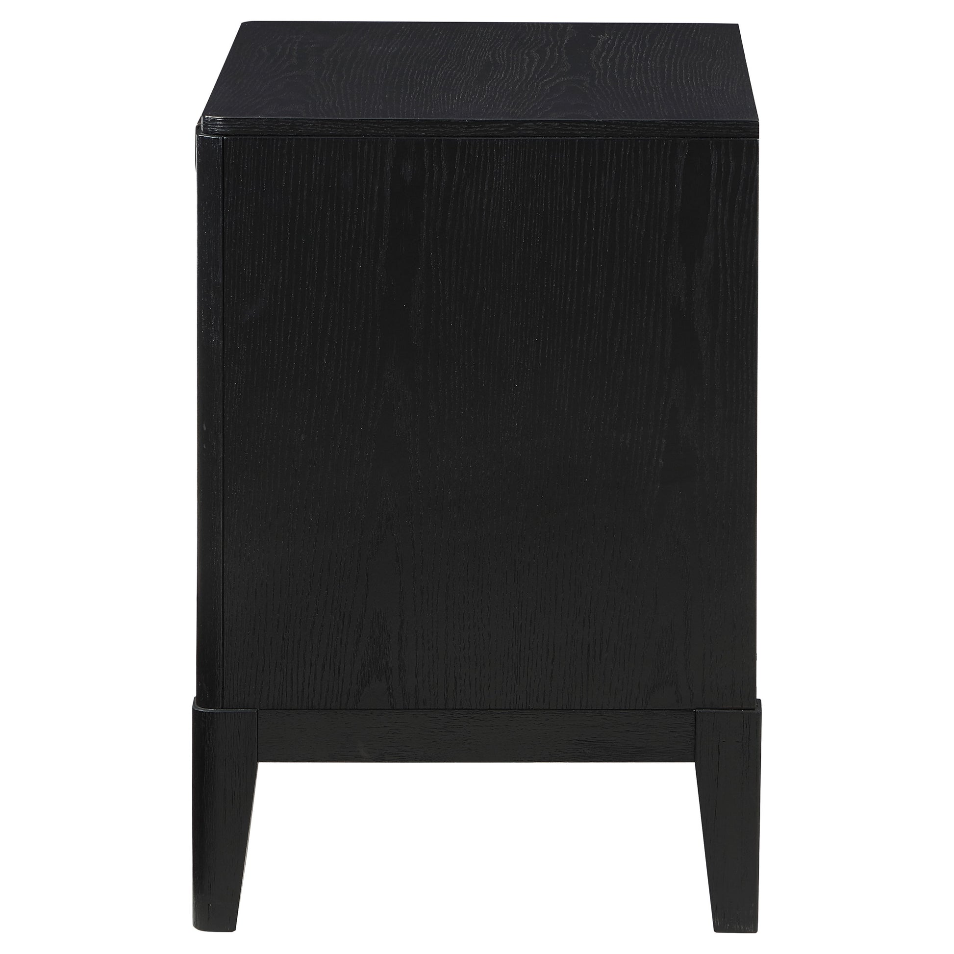 Augment your sophisticated bedroom with the addition of a modern two-drawer nightstand. It boasts a classic stance, with two drawers that offer a place for overnight essentials and personal necessities like books. The top drawer includes felt lining, while demi-lune pulls add metallic contrast in a soft golden hue. Fluted drawer fronts create impressive texture and depth, and a wire-brushed black finish completes the look with subtle character and tailored elegance at your bedside.