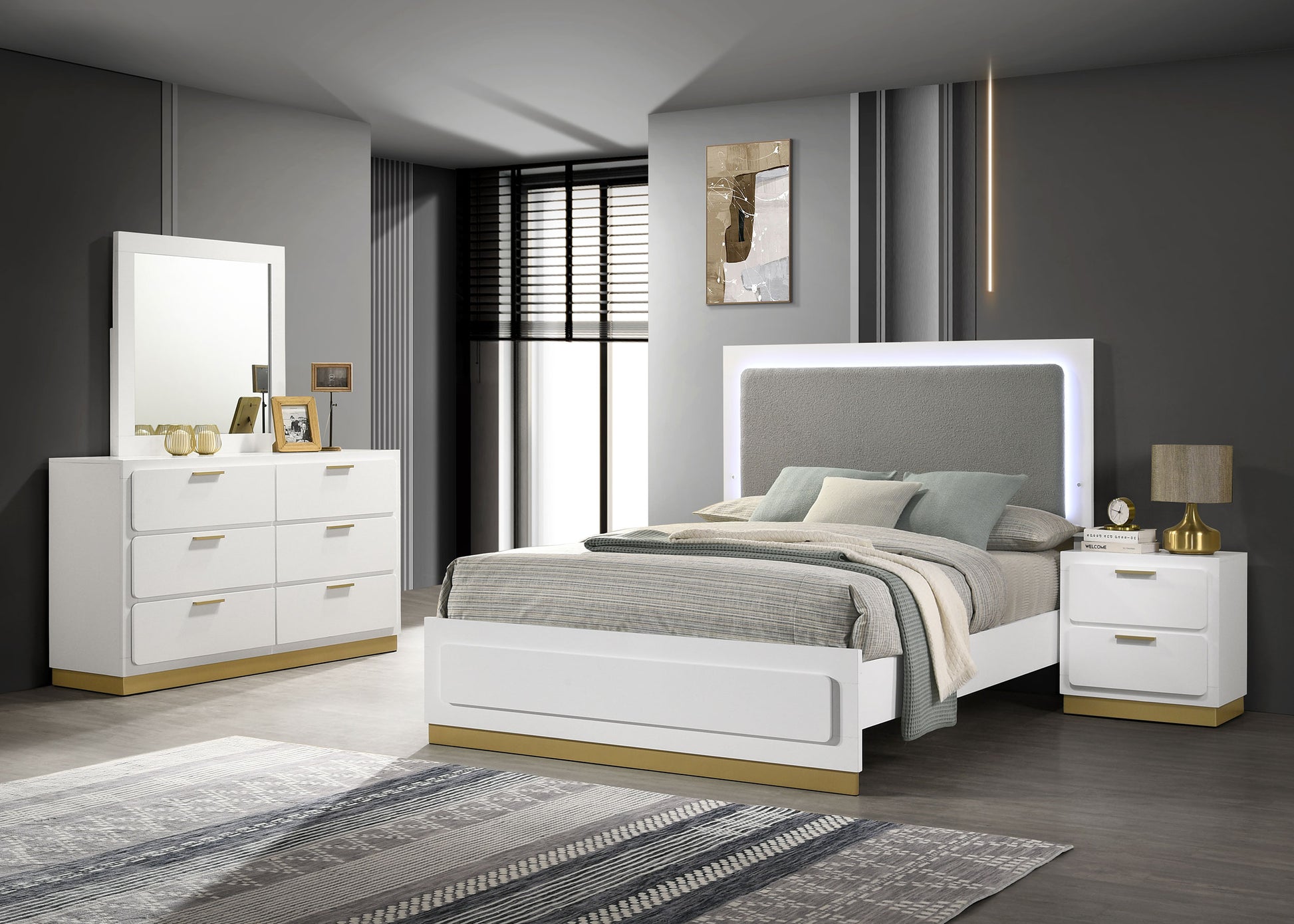 Bedroom set delivers modern styling with a streamlined silhouette and coordinated storage pieces designed for everyday function. Crafted from engineered wood with laminate veneer, it features a two-tone look with metallic accents for visual contrast. The upholstered headboard includes integrated LED lighting for ambient illumination, while drawers provide organized storage. Designed as a bedroom set or furniture suite, it creates a cohesive and contemporary bedroom environment.