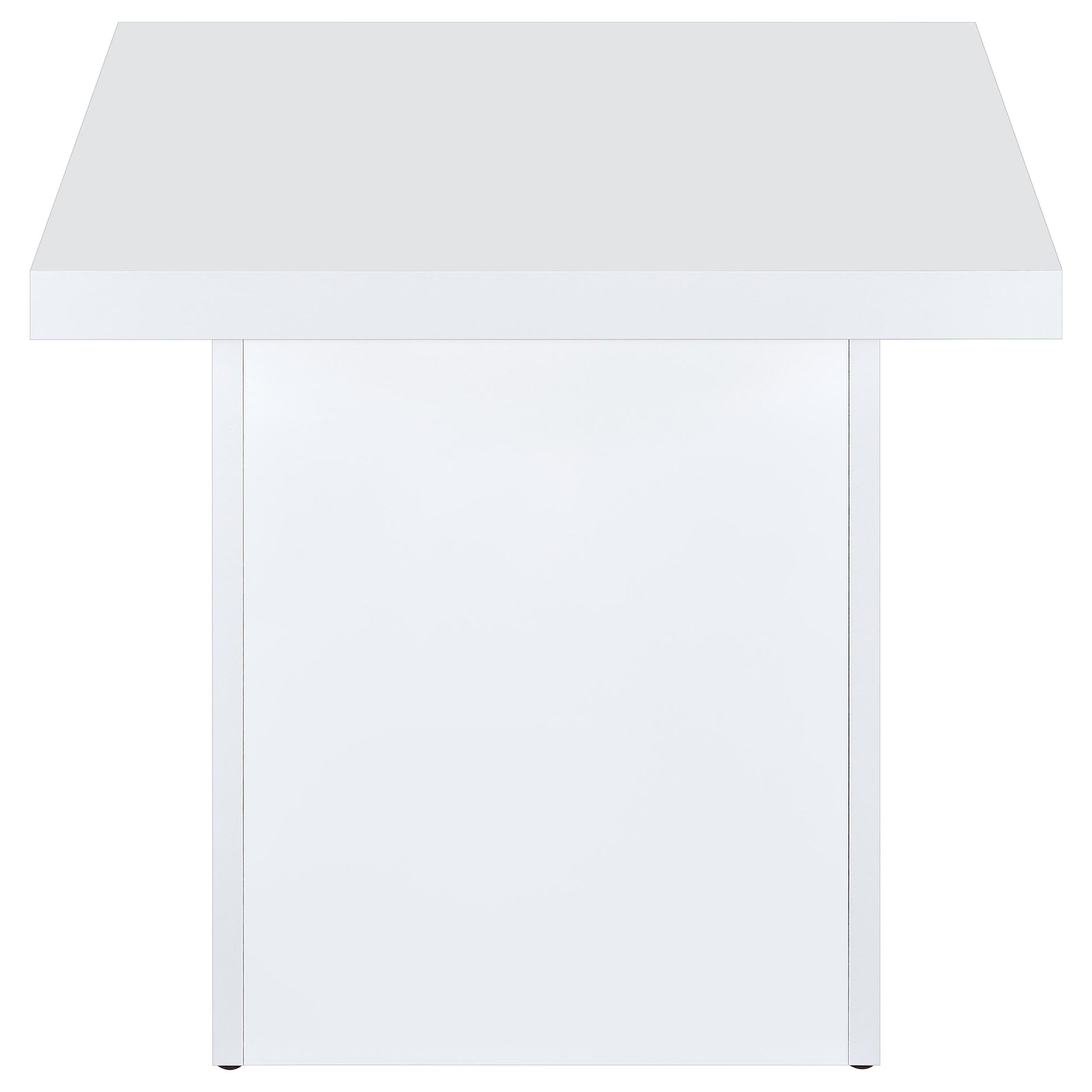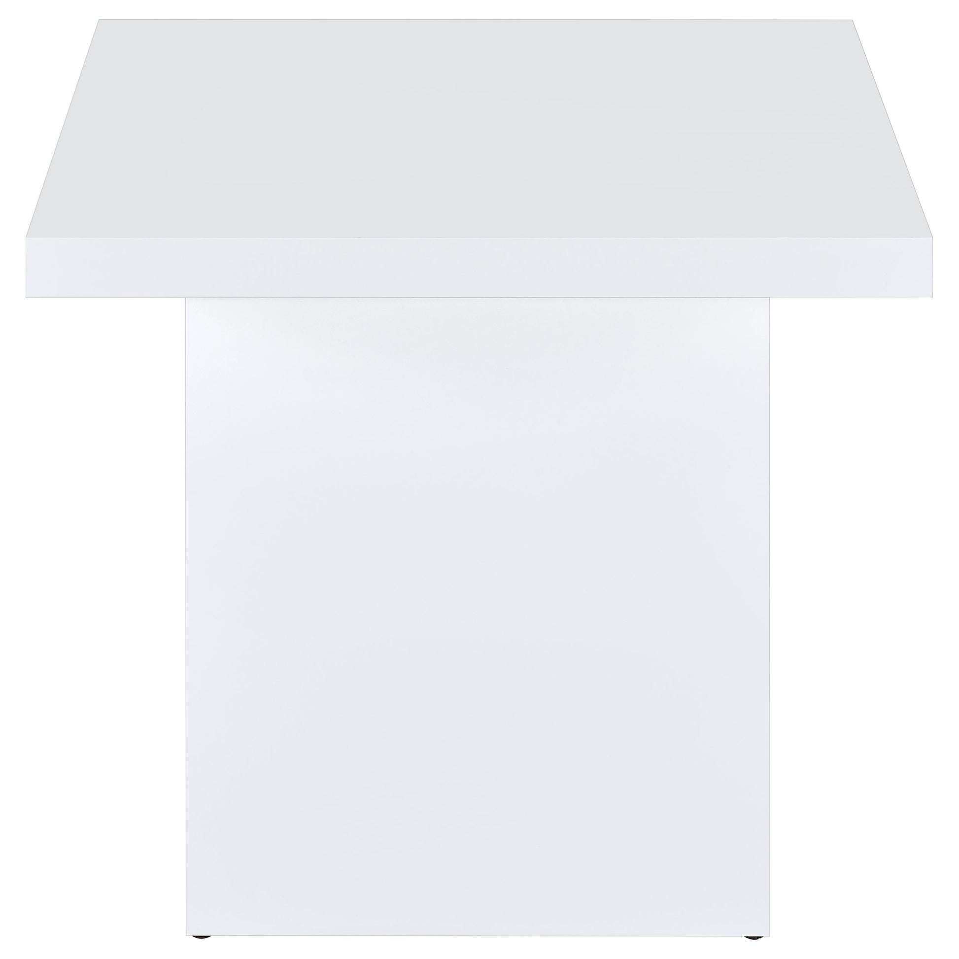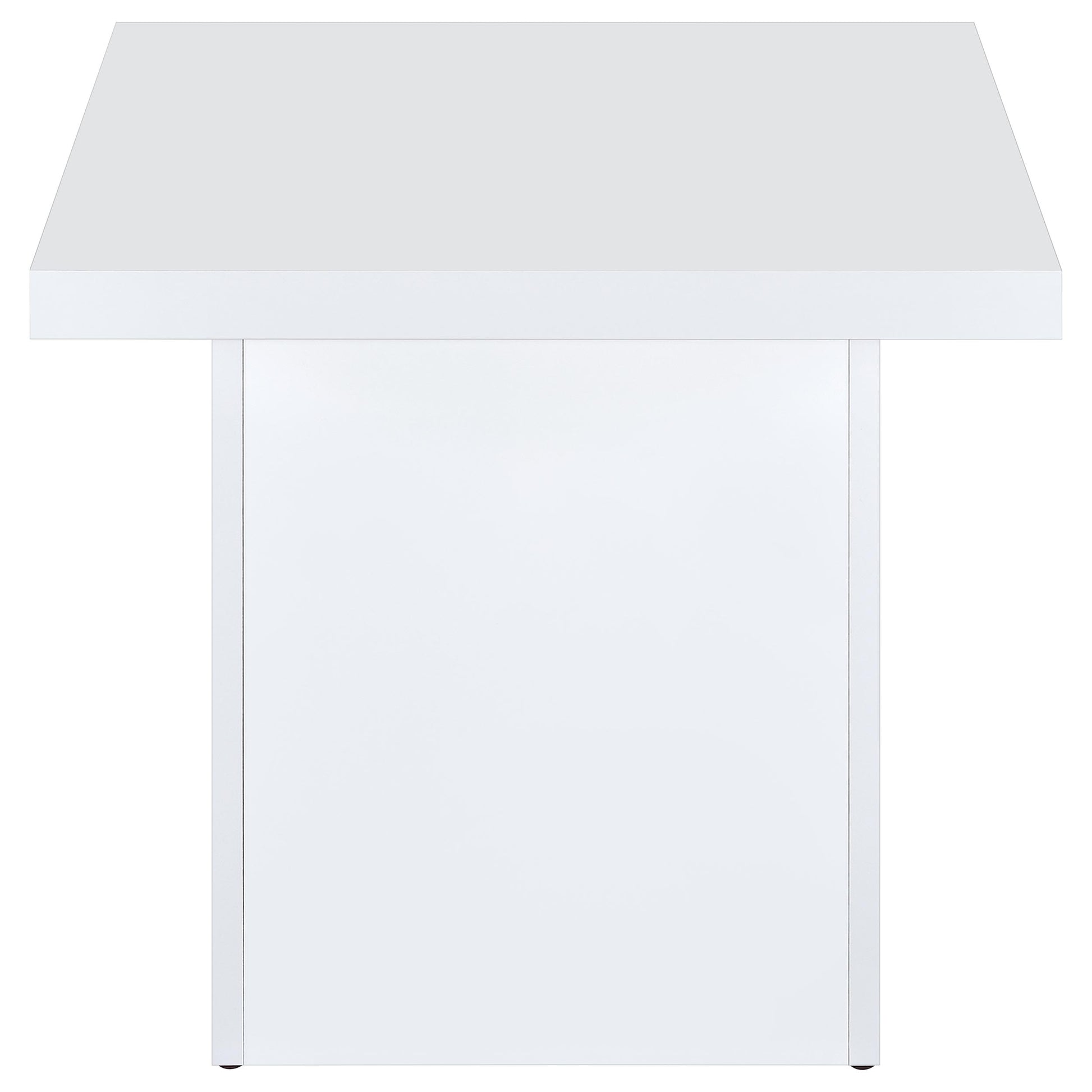 Striking in its simplicity, this end table blends sculptural form with a sleek white polyurethane high gloss finish. A thick square top rests on a wide plinth base, creating a clean architectural silhouette. The reflective surface adds brightness to any setting. Crafted from engineered wood with a durable polyurethane coating, this table functions beautifully as a modern end or side table in glam-inspired, minimalist, or open-concept interiors.