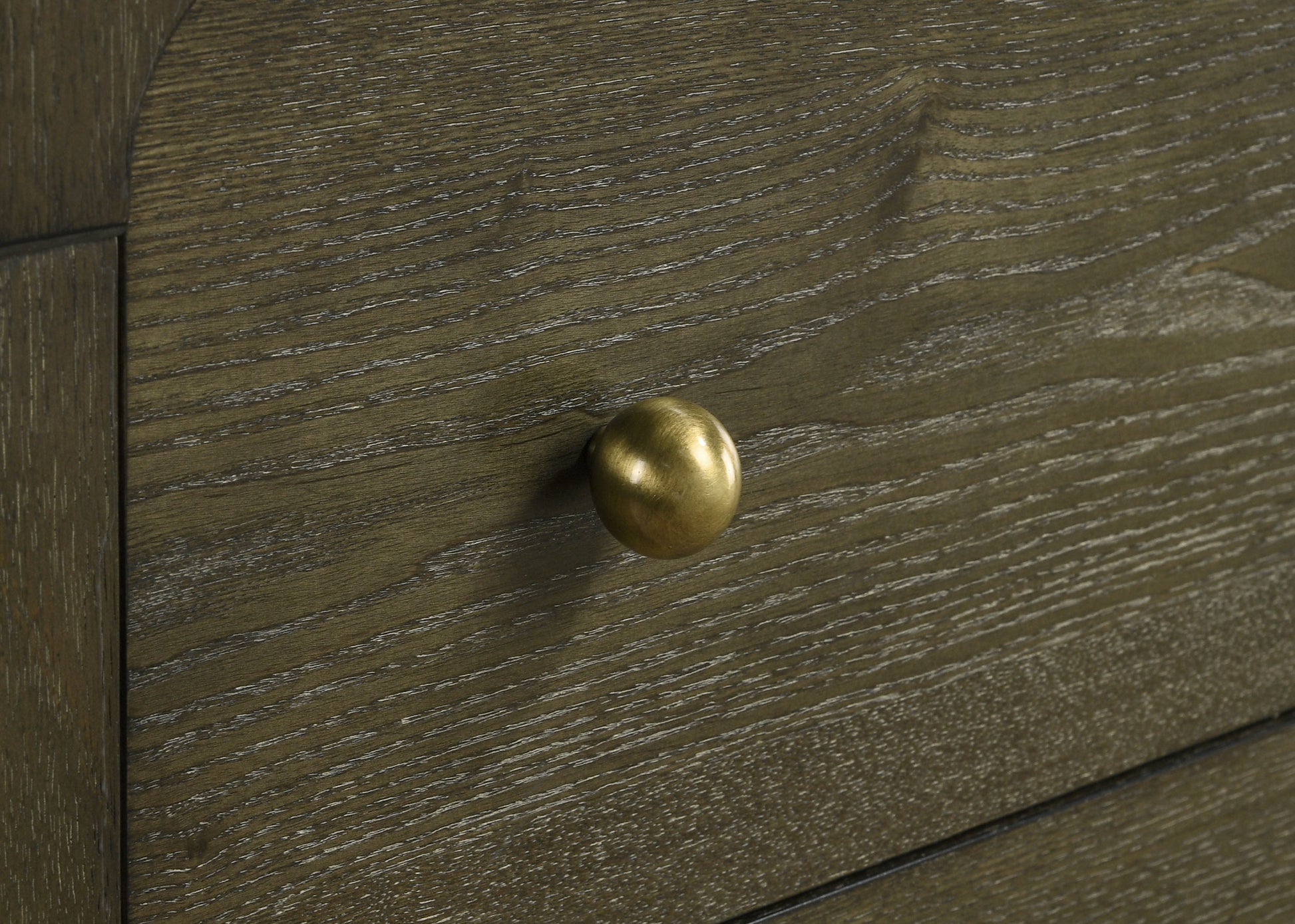 • Brass knobs add polished contrast to the bedside silhouette