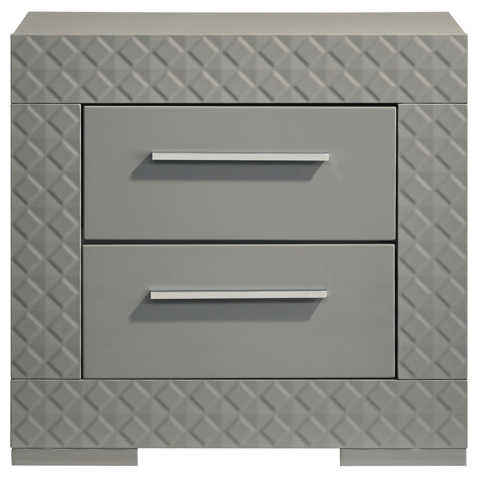 • Two-drawer nightstand in grey high gloss features a sleek modern profile