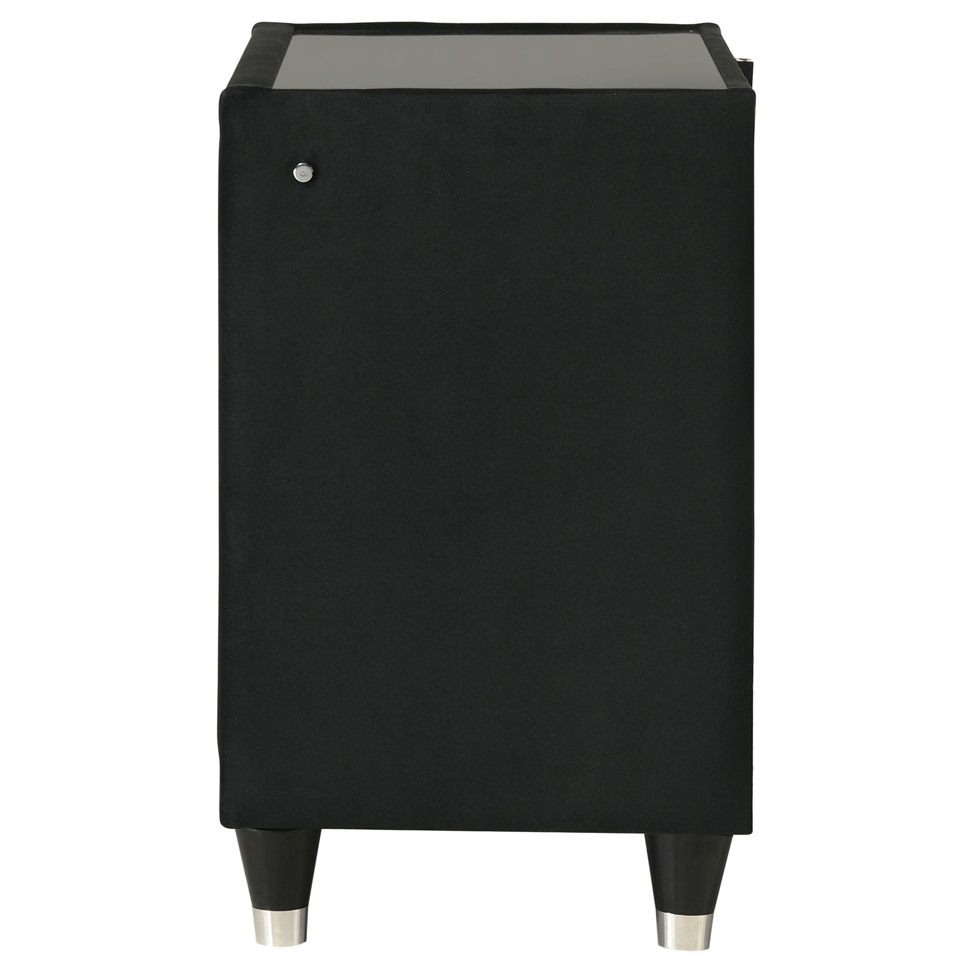 • Two-drawer nightstand fully upholstered in a black velvet for luxe layering