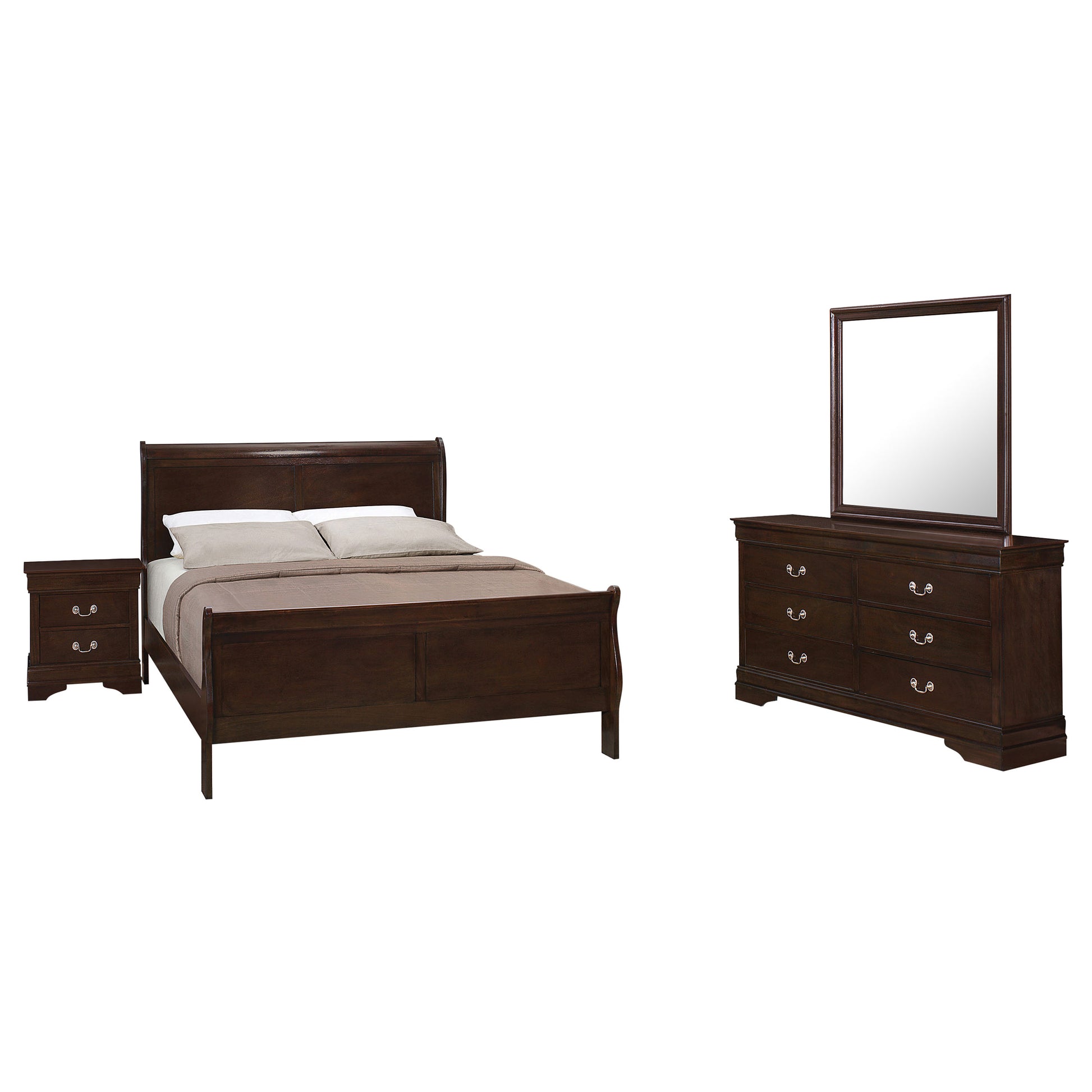 This bedroom set brings classic traditional style to a guest or youth bedroom with a warm cappuccino finish and coordinated storage. The bed features a slightly flared headboard and low footboard for a familiar Louis Philippe silhouette, while matching case pieces offer deep drawers with dovetail construction and nickel bail handles. A rectangular mirror completes the arrangement with balanced reflection and polished everyday function.