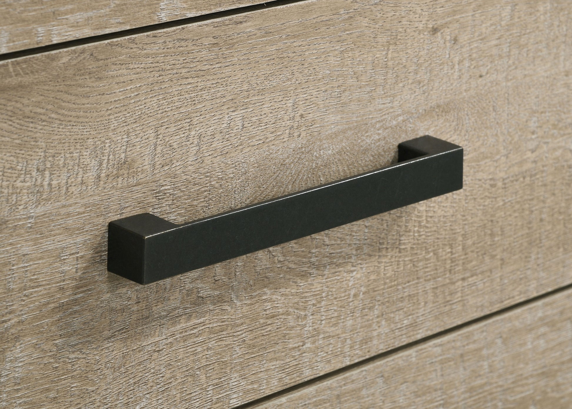 • Dark bronze metal handles add modern contrast to the rustic tone