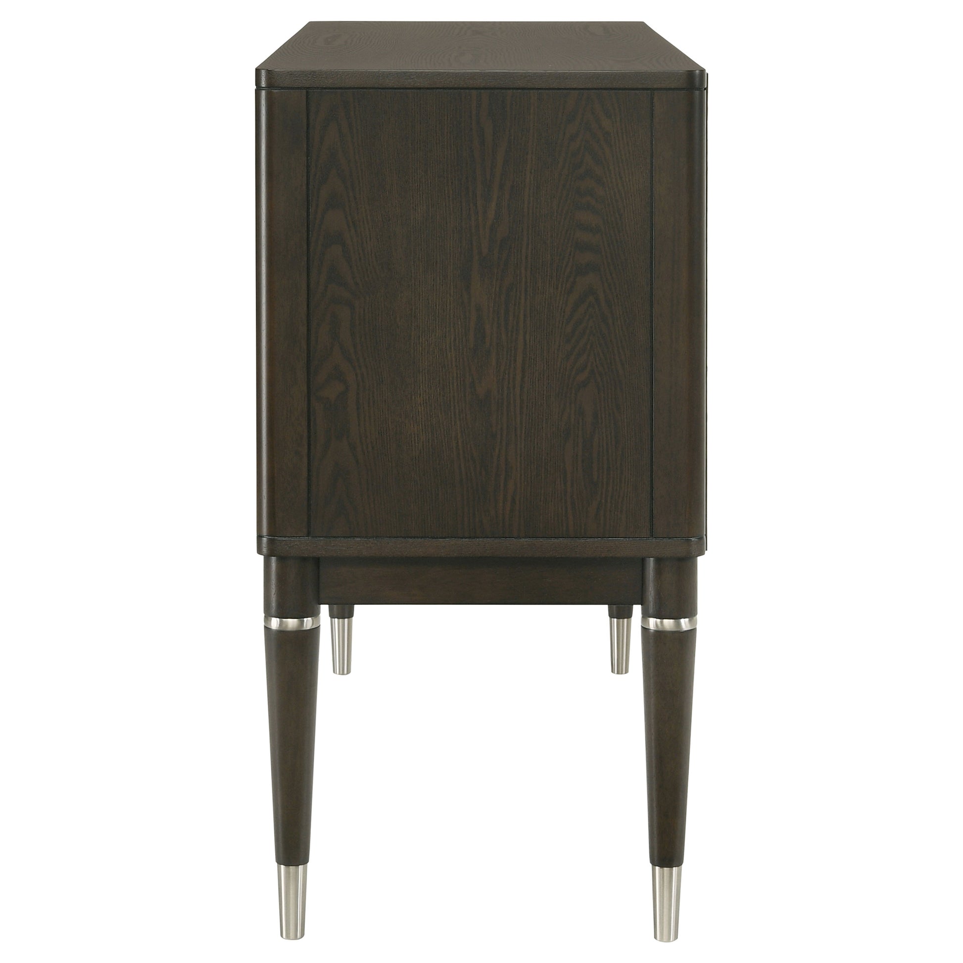 Add both style and functionality to your dining room with this elegant sideboard, finished in a sophisticated ash brown wood tone. The clean-lined design features four cabinet doors that open to reveal spacious shelving, perfect for storing tableware, linens, or other essentials. Crafted from engineered wood, rubberwood, and ash veneer, it ensures long-lasting durability. Sleek metal-capped tapered legs and minimalist hardware accents complete the modern aesthetic, making this sideboard a refined and practical choice for your dining area.