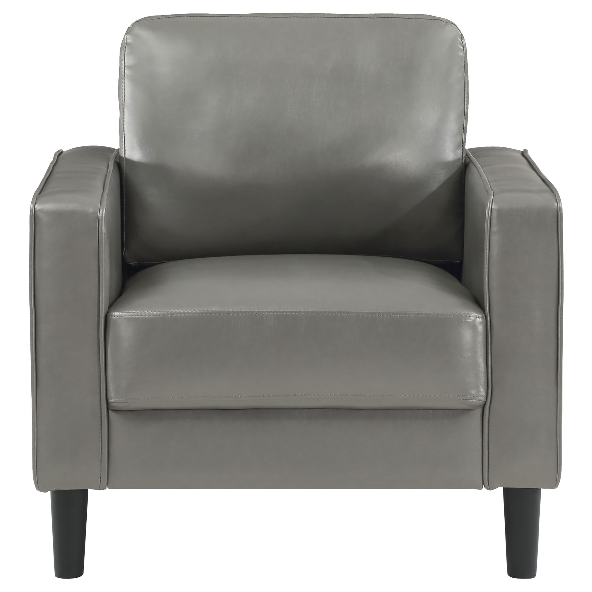 Take a no-fuss approach to your living room decor with the coordinated sophistication of a modern three-piece sofa set that includes a sofa, loveseat, and armchair. Each piece is defined with a structured silhouette and square track arms. Its simple, refined look includes smooth faux leather upholstery, offering a pleasing seating experience with plush cushions. Each piece sits on straight, tapering legs that create a touch of height for an airy, modern look and feel in your living room. Seating is supported with sinuous springs and webbed decking add support behind attached back cushions for optimal comfort.