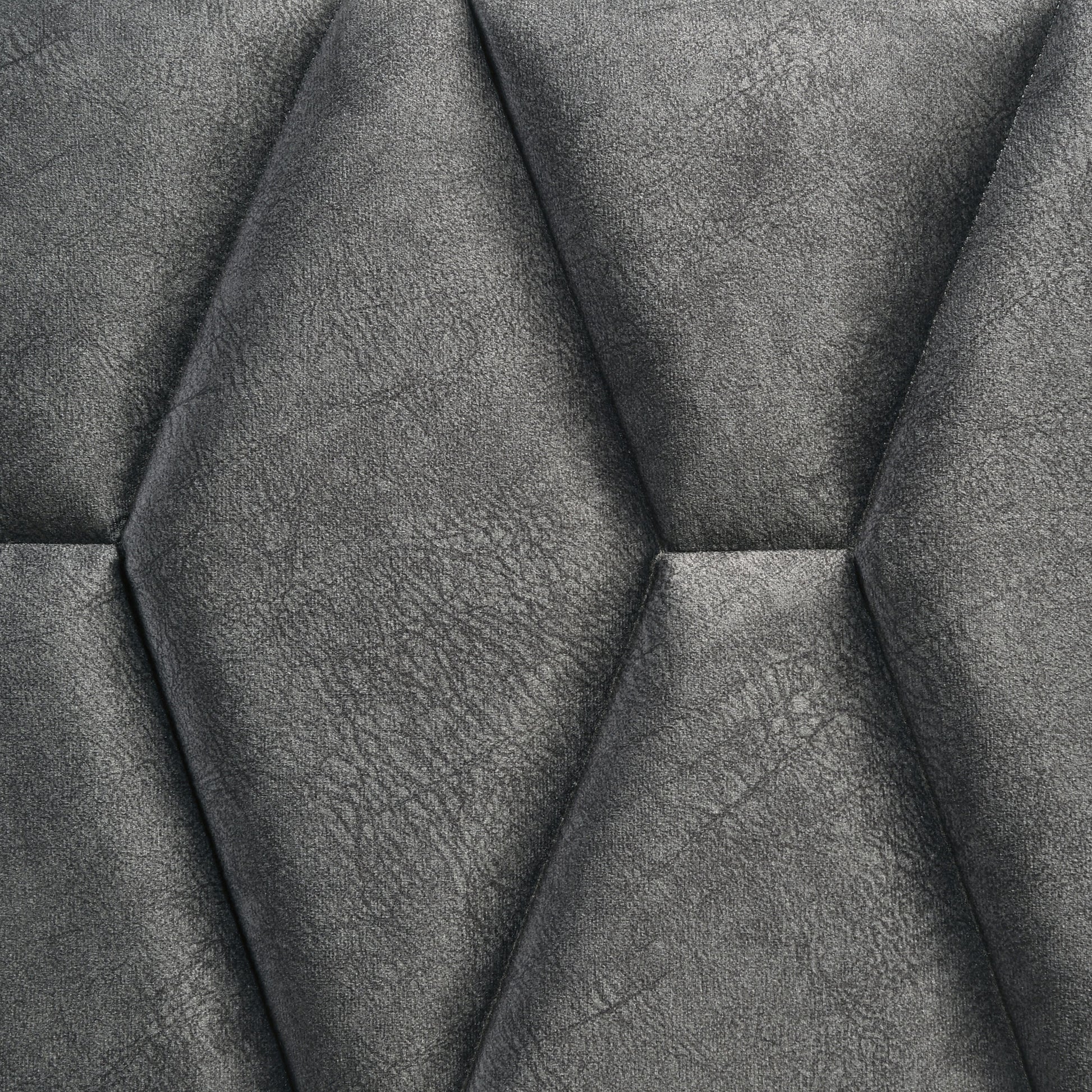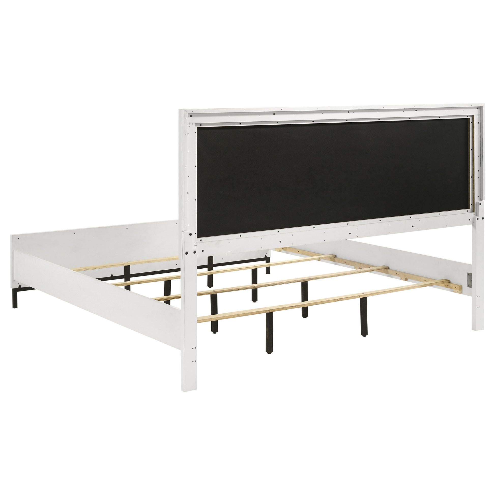 A modern bedroom set creates a crisp and refined retreat with clean lines and contemporary contrast. Crafted from engineered wood with a durable laminate veneer, it features a bright white finish paired with black accents throughout. The bed showcases a tall upholstered headboard with geometric tufting for added texture and comfort. Coordinating storage pieces include a six-drawer dresser and two-drawer nightstand, offering organized storage and a cohesive modern aesthetic.