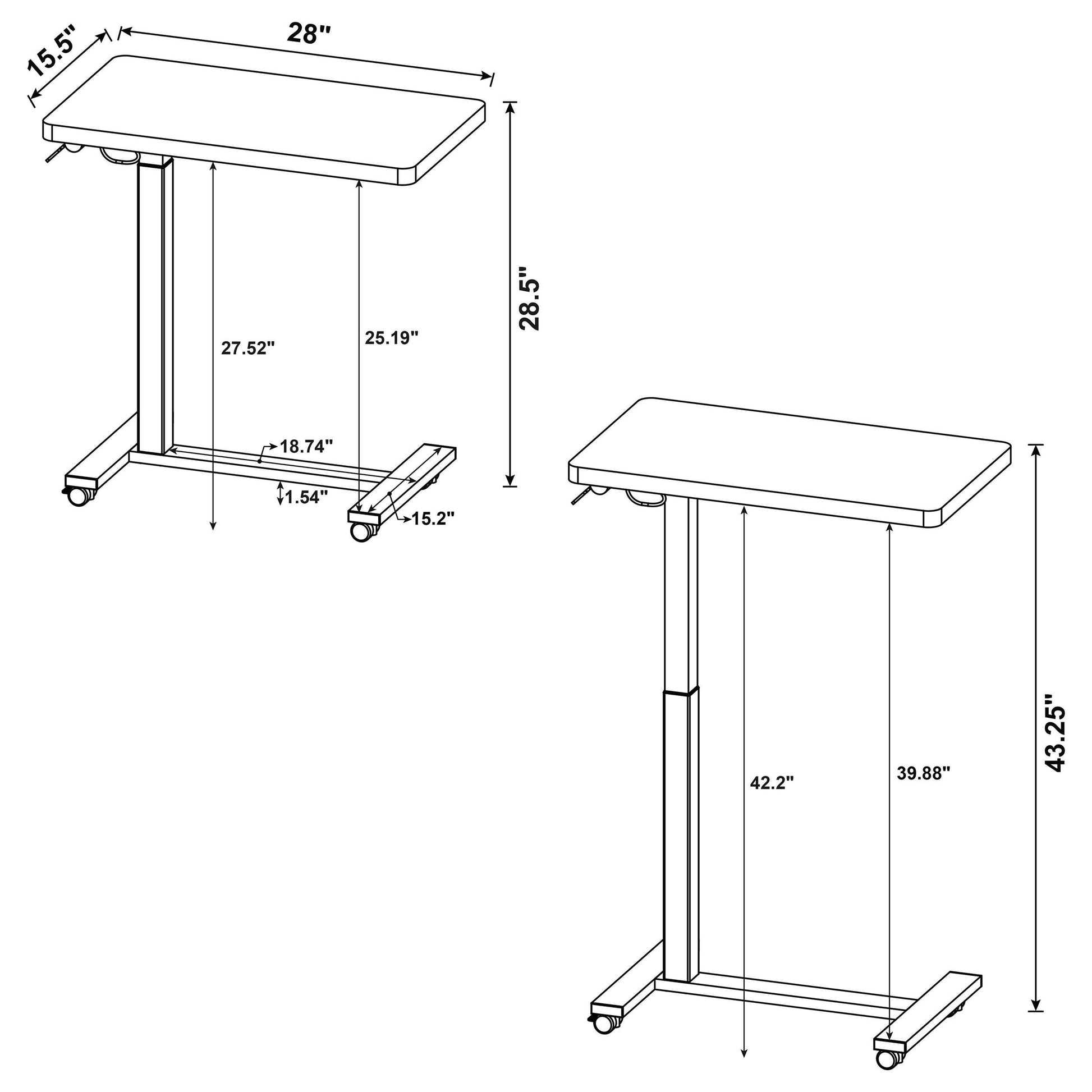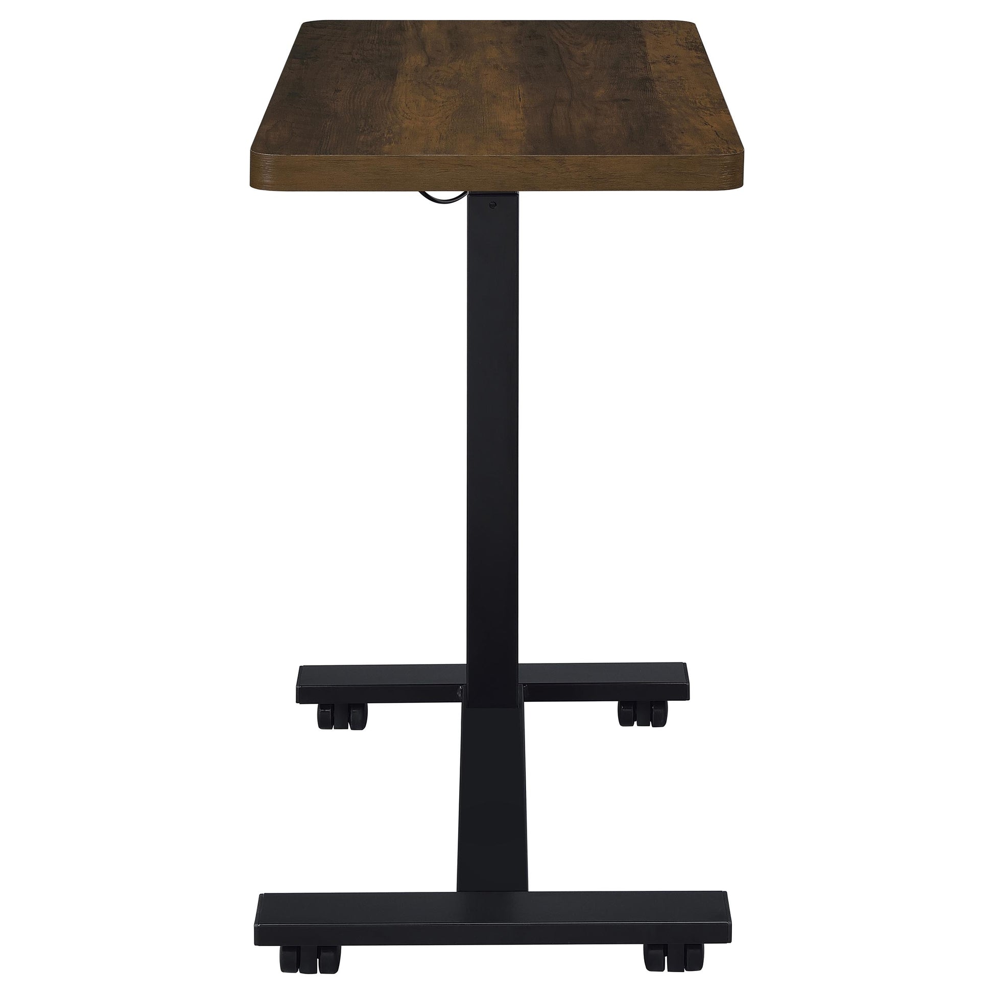 • Dark pine side table pairs a pneumatic adjustable top with a mobile C-shape frame